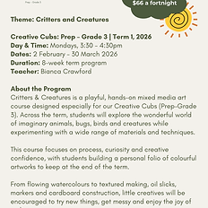Teacher: Bianca Crawford Ages: Prep - Grade 3 Price: $270 for 9 weeks or $66 a fortnight Class Size: up to 15 students A fun, mixed media art course where young artists create colourful, imaginative creatures while exploring watercolours, markers, oil slicks, collage and cardboard making. About the Program Critters & Creatures is a playful, hands-on mixed media art course designed especially for our Creative Cubs (Prep–Grade 3). Across the term, students will explore the wonderful world of imaginary animals, bugs, birds and creatures while experimenting with a wide range of materials and techniques. This course focuses on process, curiosity and creative confidence, with students building a personal folio of colourful artworks to keep at the end of the term. From flowing watercolours to textured making, oil slicks, markers and cardboard construction, little creatives will be encouraged to try new things, get messy and enjoy the joy of making. Throughout the term, students will: Explore a variety of art materials including watercolours, markers, oil slicks, collage and cardboard Learn basic art techniques such as layering, colour mixing, pattern-making and texture Develop fine motor skills and hand–eye coordination Build confidence in creative decision-making Learn how to follow a creative process from idea to finished artwork Create and curate a folio of artworks that shows their learning and growth What’s Included: All art materials Weekly guided art sessions A growing folio of completed artworks A supportive, playful studio environment What to Bring: Drink bottle, clothes that can get messy... we have aprons. A fun, hands-on workshop perfect for all skill levels!