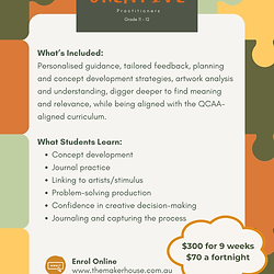 Teacher: Bianca Crawford Ages: Prep - Grade 3 Price: $270 for 9 weeks Class Size: up to 12 students About the course: Deepen your senior Visual Art practice with targeted tutoring for concept development, ideation, and journal work aligned with the QCAA curriculum. Bianca, an experienced Visual Art teacher with a background in Industrial Design, will guide students to develop concepts, connect to relevant artists, and problem-solve production techniques. Small group sessions offer personalised support, building confidence in ideas, evidence of connections, and preparation for assessment. What’s Included: Expert guidance, tailored feedback, idea development strategies, handouts to support understanding when needed and QCAA-aligned support. What Students Learn: Concept development, journal practice, linking to artists/stimulus, problem-solving production, confidence in creative decision-making. What to Bring: Journal, notes from class, stimulus resources, drink bottle, clothes that can get messy... we have aprons.